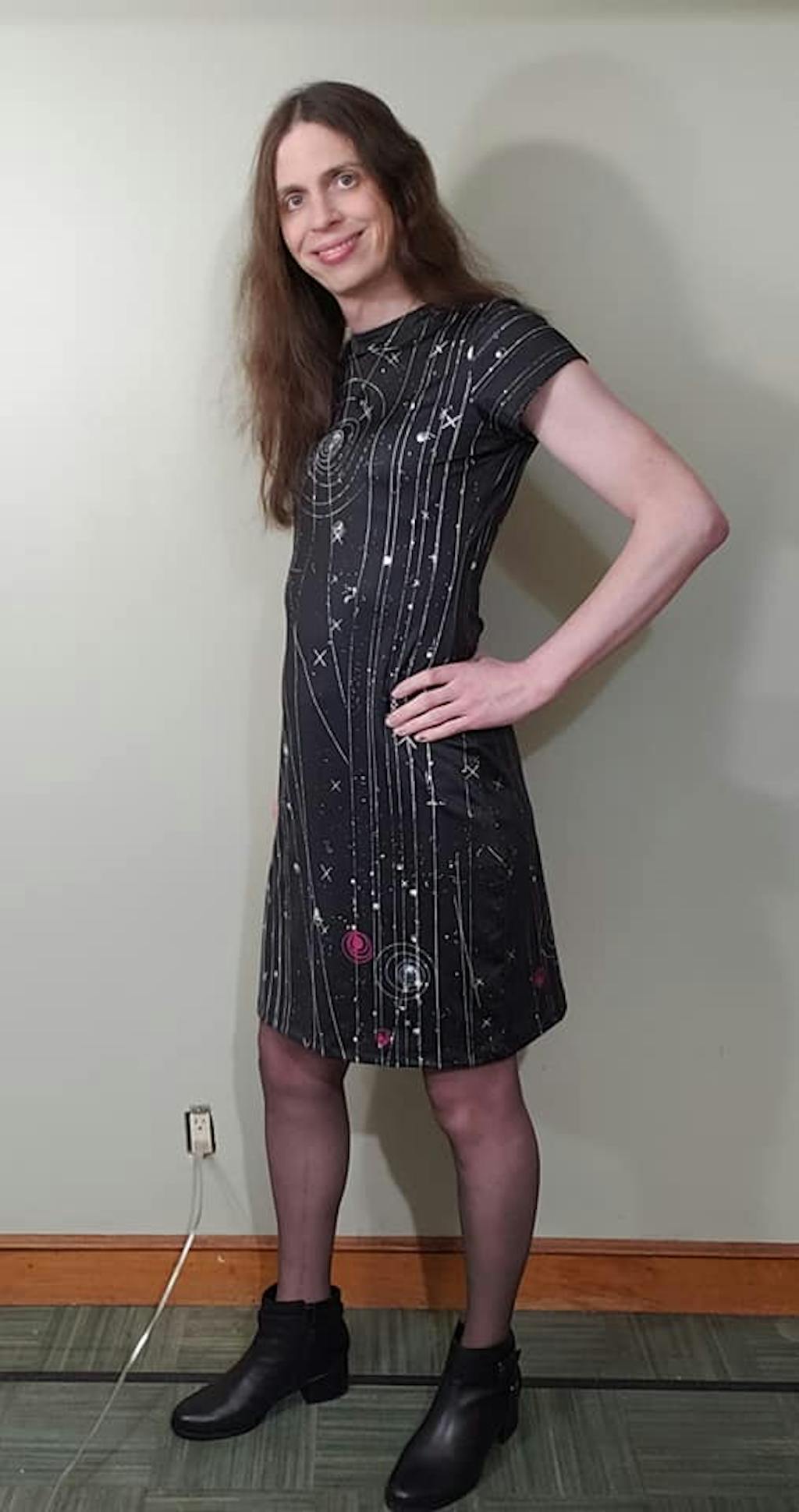 I love the cut and look of this dress. I wore it to teach my high school physics classes last Thursday and was getting compliments in the halls and by other faculty. I'm 6' 0", so the sleeves come to my elbows rather than just past as shown, but it's still a lovely effect. A passing student wanted to know where the Big Dipper was (It's on the back on my cut, with Ursa Major wrapping around the right side near the waistline.) I'll be revolving it through my wardrobe regularly